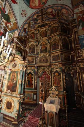 Biserica mare este o construcţie din piatră şi cărămidă în plan triconic, cu absidele semicirculare. Spaţiul este împărţit în altar, naos, pronaos şi pridvor închis. Altarul este luminat de o fereastră mare la răsărit şi una mică la nord, în proscomidie. În sudul altarului a fost adăugat un diaconic-veştmântar. Pe altar este o turlă oarbă, din lemn. În altar se păstrează o icoană a Mântuitorului Hristos, care a aparţinut probabil catapeteasmei vechii biserici. La proscomidie, într-o raclă de argint se păstrează o cruce de lemn în mijlocul căreia este fixată o cutiuţă din argint, în care se află părţi din moaştele Sfântului Ierarh Nicolae, dăruite de cuviosul monah Ghedeon Vârnav (în mirenie Iordache Vârnav), ctitorul sfintei icoane a Maicii Domnului din biserică, aşezată într-o strană specială la 20 iunie 1869. Catapeteasma este ornamentată cu o frumoasă sculptură, în parte aplicată. Naosul cu abside largi este luminat de câte o fereastră pe fiecare absidă. Delimitarea de pronaos se face printr-o arcadă puternică, lată, care susţine cele două bolţi din naos şi pronaos. În naos este scaunul arhieresc construit în stil baroc. Pe naos este o turlă mare, oarbă. Pronaosul este luminat de o fereastră la sud, alta la nord. În pronaos este amvonul în stil baroc. Pe pronaos se află a treia turlă a bisericii, de asemenea, oarbă. Toate cele trei turle sunt de formă octogonală în exterior, cu acoperişuri înalte în formă de mitră arhierească, acoperite cu tablă aşezată în solzi, vopsită bej-crem şi cu cruci deasupra. Ferestrele din altar, naos, pronaos sunt duble, terminate în arc şi cu grilaj metalic la mijloc. Pridvorul, cu intrarea prin vest, pe o uşă de stejar sculptat, este luminat de câte o fereastră mică, dreptunghiulara, aşezată pe fiecare parte. Sub cornişe are o frumoasă ornamentaţie. Este susţinut de patru coloane în faţă şi alte trei pe fiecare parte laterală, fixate în soclul fundaţiei cu o frumoasă ornamentaţie sculpturală în partea superioară. Coloanele susţin grinzile pridvorului. Din pridvor în pronaos se intră pe o uşă din lemn, cu geamuri în partea superioară. Tot mobilierul din biserică este din lemn frumos sculptat. Pardoseala este din ciment mozaicat iar acoperişul din tablă zincată. Faţada bisericii este fragmentată de coloane dreptunghiulare, angajate în structura zidului, perpendiculare pe soclu, ornamentate în partea superioară. Coloanele (stâlpi de susţinere) sunt în zona altarului, naosului şi pronaosului.